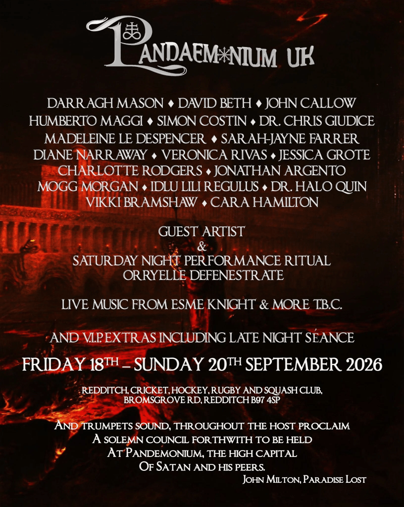 As mentioned above Sarah-Jayne will be giving her talk “Black Glass Masquerade: Reflections of the Hidden Face” at Pandaemonium UK, alongside an amazing line-up: